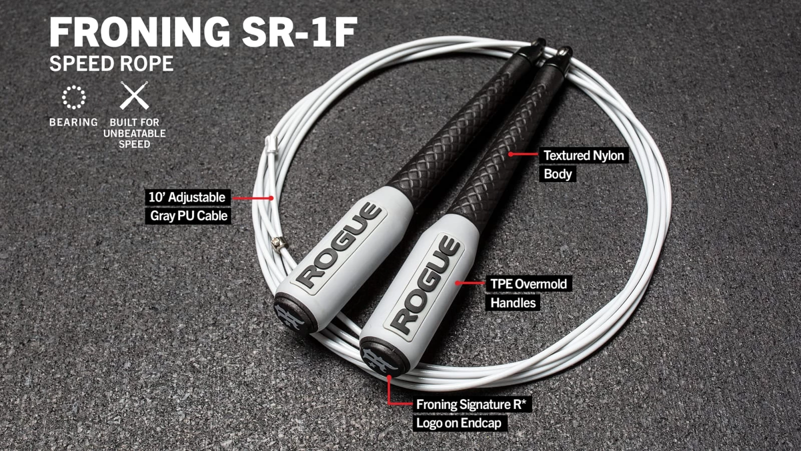 Rather than just naming a rope in his honor, we worked directly with Rogue athlete and 4-time CrossFit Games champion Rich Froning Jr. to develop a new speed rope he’d want to use in his own gym. Every detail, from the tapered 6.5” rotating handles and TPE overmold grips to the unique color scheme (black handles with a grey coating on the grips and cable) were discussed in detail. Polyurethane was chosen for the cable for its durability and superior flexibility vs. nylon—it won’t show much coil after being rolled up in a gym bag. The official Froning R* logo was added to each handle endcap, and an adjustable end of the cable was included to allow for customization regardless of athlete height.