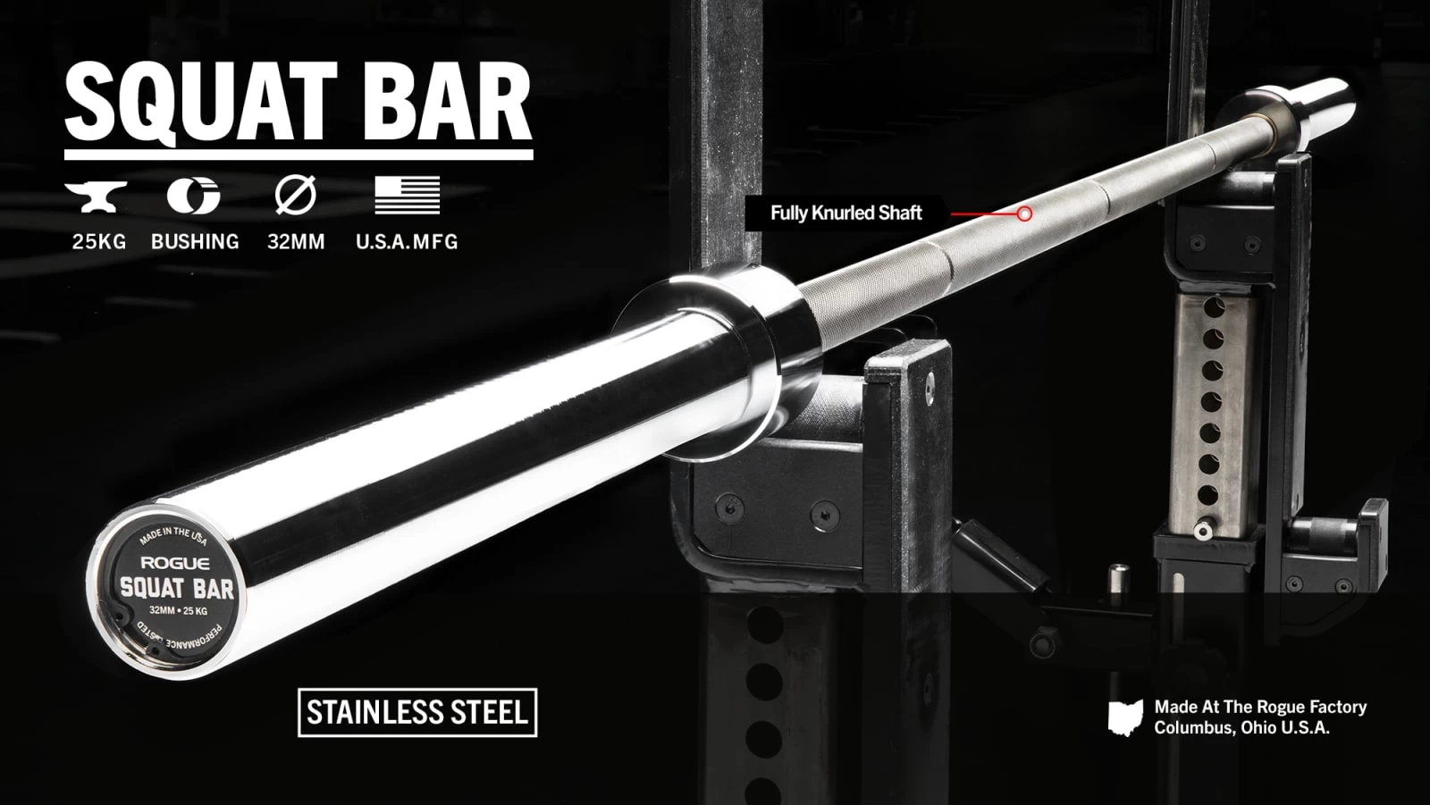 The 32MM Squat Bar is another Rogue-exclusive, Ohio-built power bar, featuring a deep, coarse knurl pattern for optimal “stick” and an oversized stainless steel shaft for reduced whip/flex on heavy loads. We sent the prototype through the gauntlet of abuse (aka product testing) at Westside Barbell, and only after they gave it their approval did we move forward into mass production.