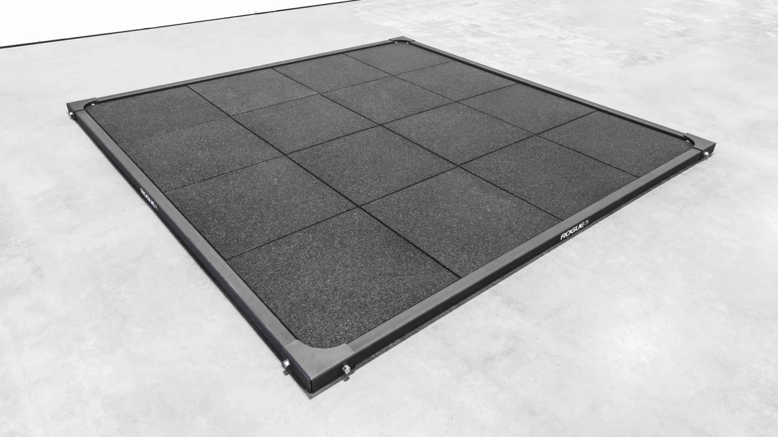Made in the USA with 2×2″ 11-gauge steel, the platform’s frame bolts together easily with gusseted corners. From there, you can add a set of shock-absorbing rubber tiles to your order, available in your choice of a smooth or crumb finish. These tiles can be purchased in a full 16-pack, to cover the entire platform, or in an 8-pack—for customers who prefer to use their own plywood sheet in the center of the platform to finish the job (see photos above for examples of set-ups).