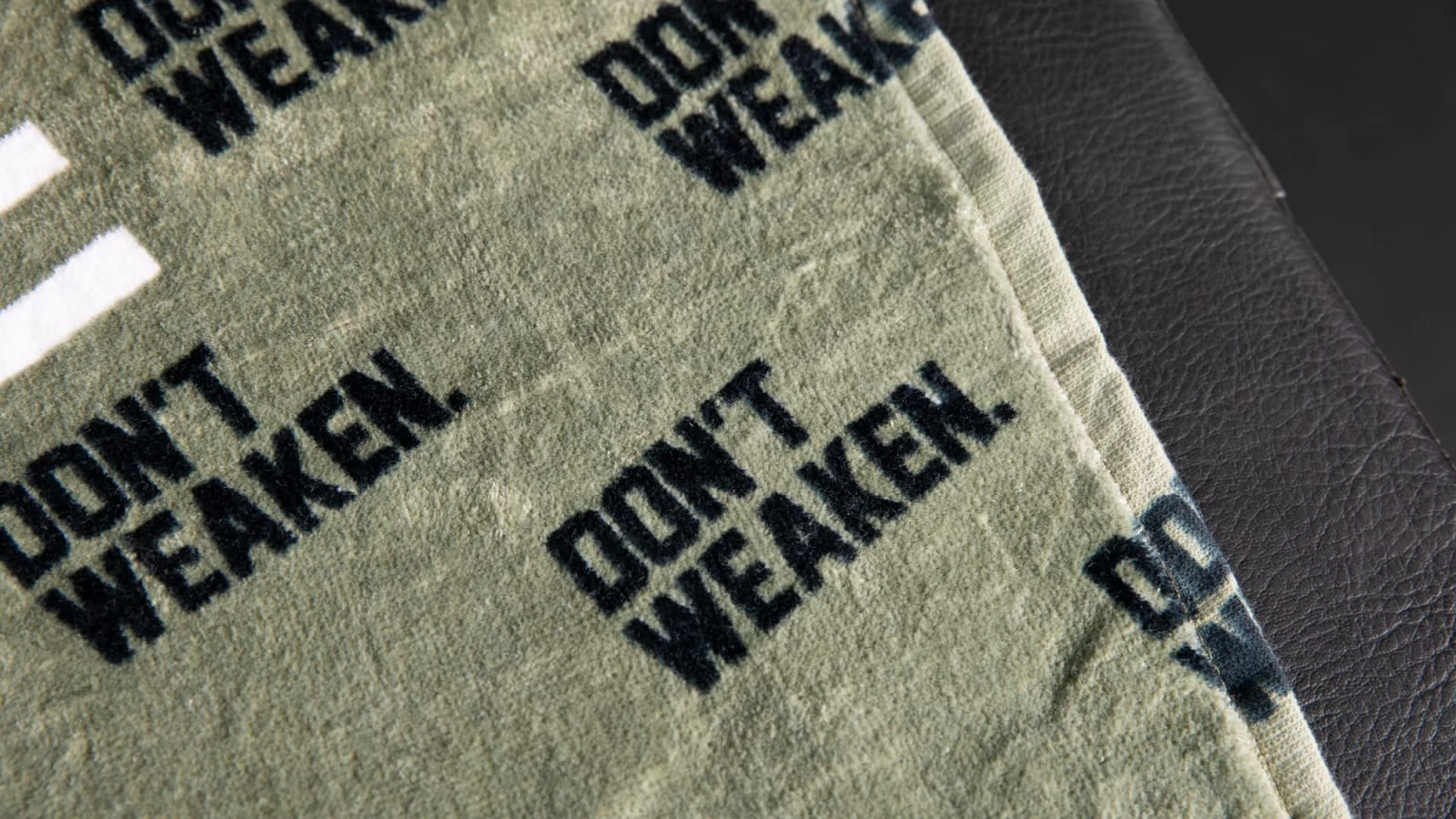 Rogue’s “Don’t Weaken” Gym Towel measures 17.75” x 31.5” and is made from a quality 100% cotton velour material. Stays soft through repeated uses; machine wash cold with like colors, tumble dry low.