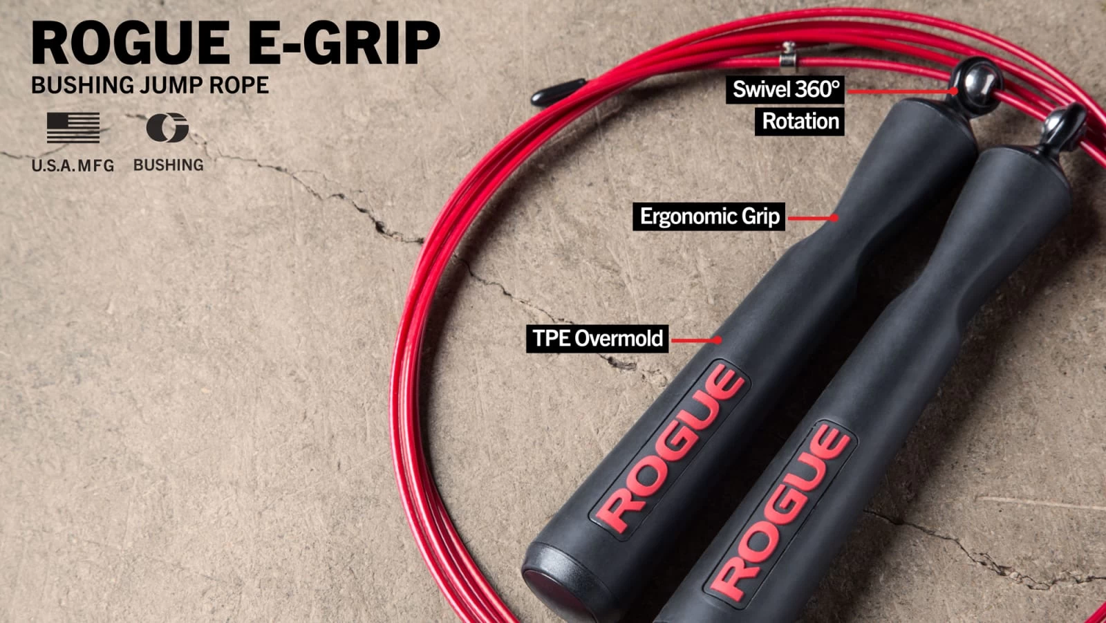 The Rogue E-Grip Jump Rope combines the same 120″ red-coated speed cable as the Rogue SR Series with a unique, ergonomic bearing handle—featuring a precision swivel design and a complete TPE overmold for a firm, comfortable grip. Each tapered handle measures roughly 14MM in diameter at its narrowest point, 27MM at the end cap, and includes an exclusive PVC Rogue logo badge.