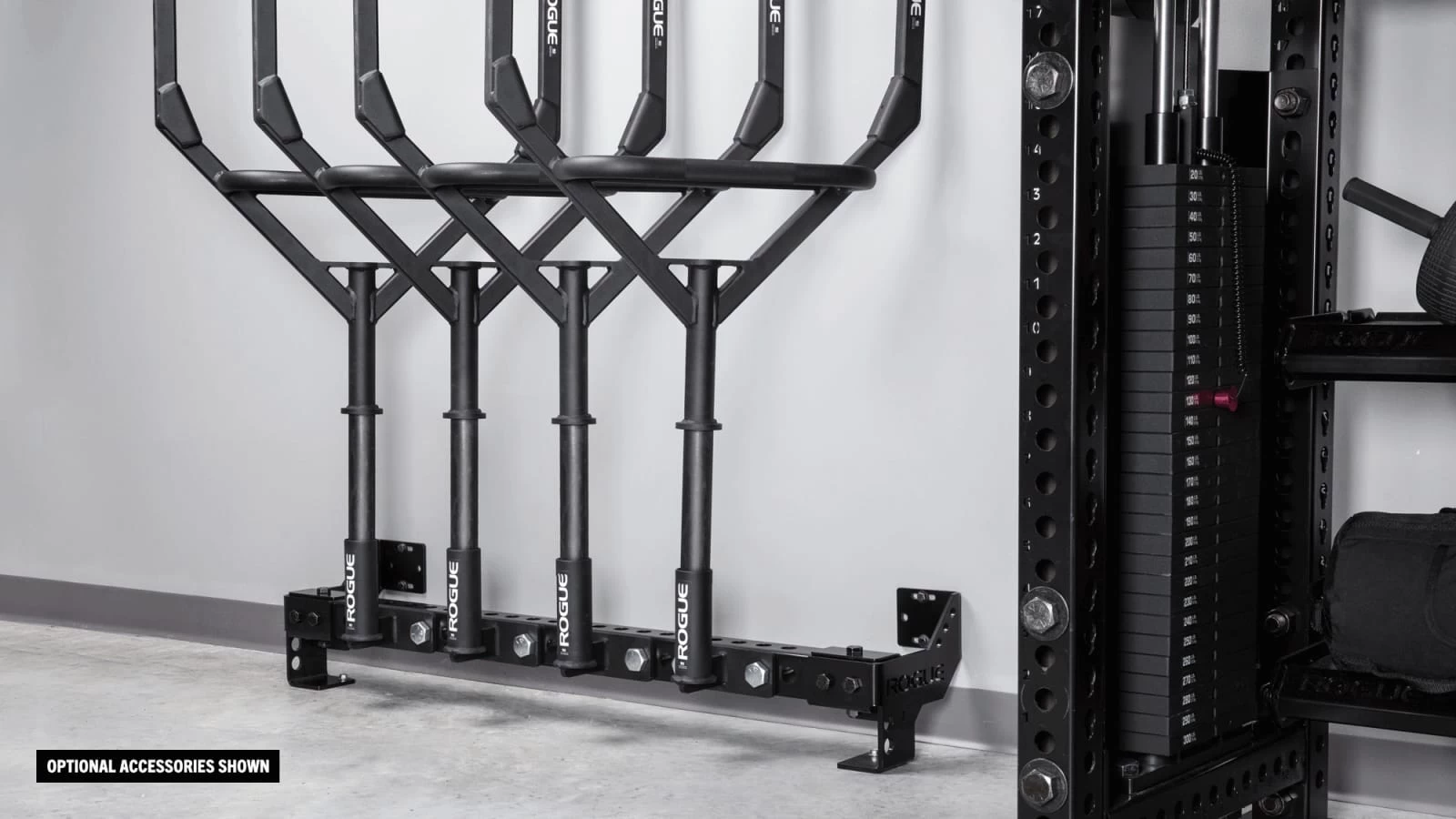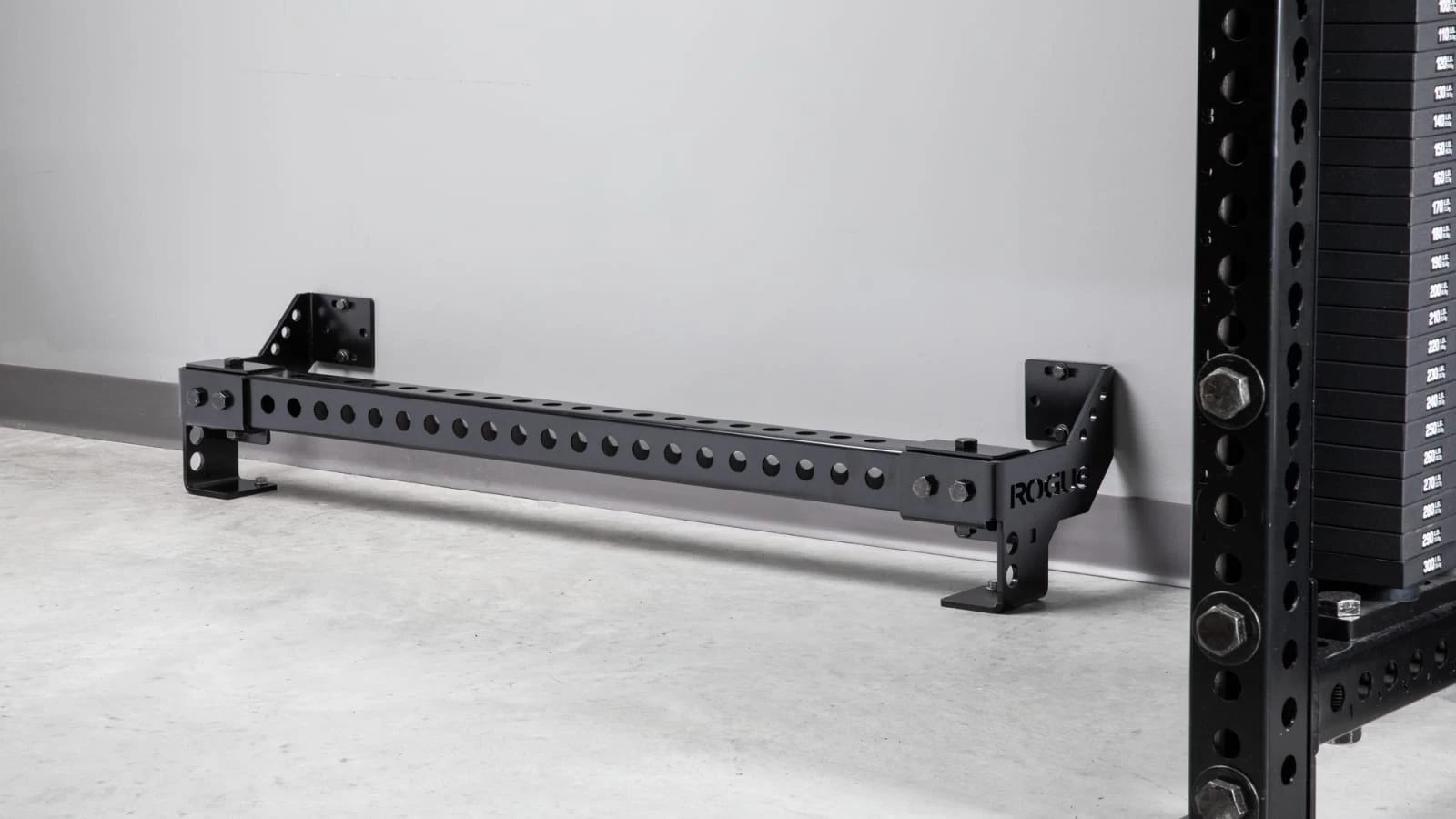 Rogue initially developed this patent-pending accessory for use in the training facility of the NHL’s Columbus Blue Jackets, and it’s now been refined for almost any type of gym layout, with mounting points spaced at 48” to fit on standard 16”-on-center wall studs. The space efficient Heavy Rail extends just 11” from the wall (11.75” with optional stringers) and measures 7-⅛” in height (from the floor to the top of the steel tube).
