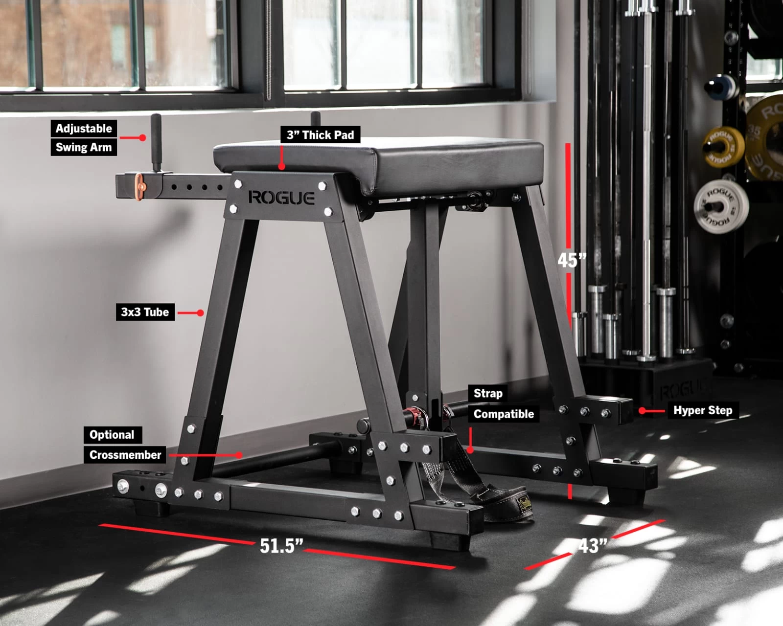 Manufactured in the USA, the Rogue Z Hyper is approved by Louie Simmons himself as an effective tool for physical therapy, back rehab exercises, and for regular everyday training—particularly for those looking to reduce back tightness and strengthen the hamstrings, glutes, and hips. Like the RH-2, the Z Hyper includes an oversized pad (35″ wide x 24″ deep x 3″ thick) with an extended back lip to keep the user’s hips from resting on any metal/hard surface. A 3×3” step on each side of the unit makes it easier to climb aboard, and rubber feet are included on the base for extra grip/stability and floor protection.