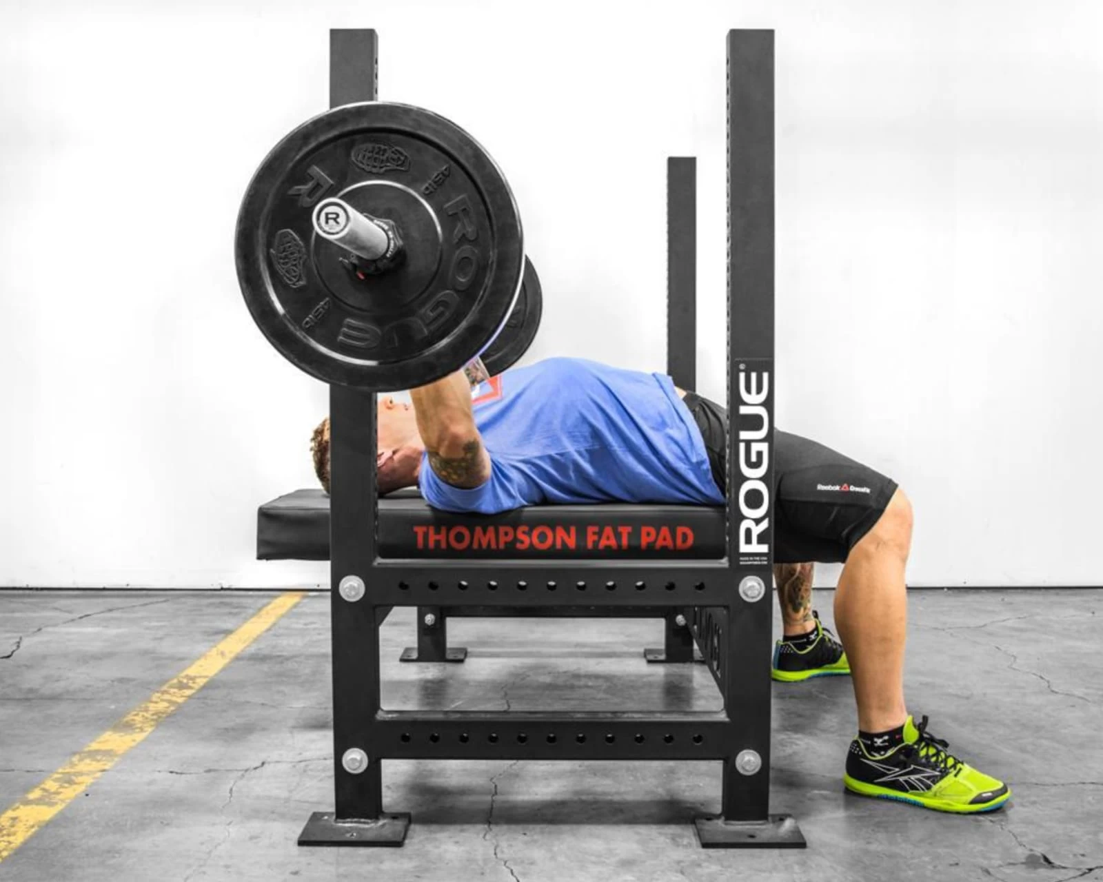 Manufactured in the USA, the Thompson Fat Pad™ by Rogue is the proper bench pad to maximize power and minimize injury. This oversized bench pad measures 50” L x 14.5” W x 4.5” H (about twice the thickness and 2.5” wider than a standard pad), and is designed to bolt onto any flat Rogue weight bench. It also includes a plywood bottom that enables it to be mounted to most other benches, as well.*